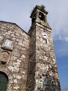 We continued down the road to Serra de Outes, and, about a kilometer away, found the parish church, San Miguel de Valladares. It's a tiny church, Romanesque, with a small churchyard. We went in, but only found a couple of mentions of my family surname on the tombstones. If the ancestor held that name, few, very distant, cousins remain in the area. The older, ground burials were different from the ones in our surrounding parishes. Most had silk flowers stabbed into the ground, surrounding the tombstone. One, in particular, had scallop shells all around it.